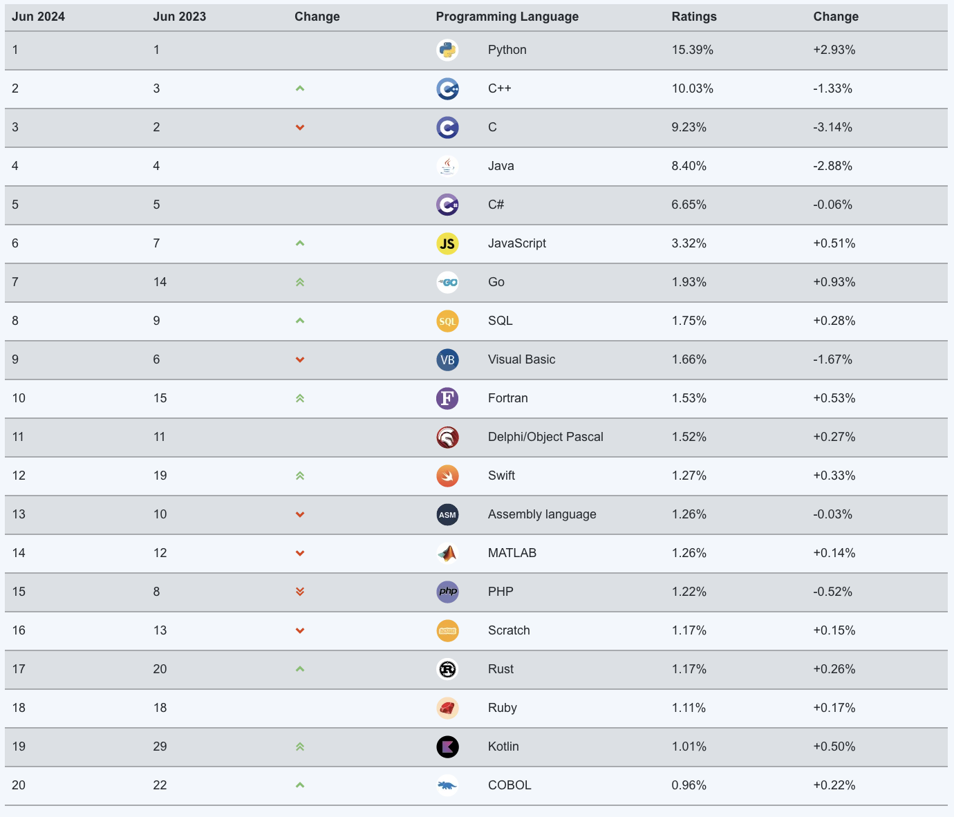 6 月 9 日消息,TIOBE 编程社区指数是一个衡量编程语言受欢迎程度的指标,评判的依据来自世界范围内的工程师、课程、供应商及搜索引擎,今天 TIOBE 官网公布了 2024 年 6 月的编程语言排行榜,整理如下: