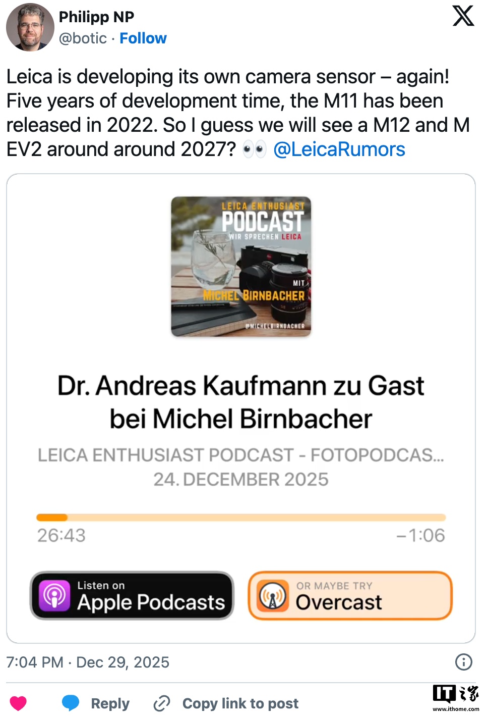 徕卡透露正自主研发全画幅 CMOS 传感器,有望 2027 年随 M12 相机首发登场